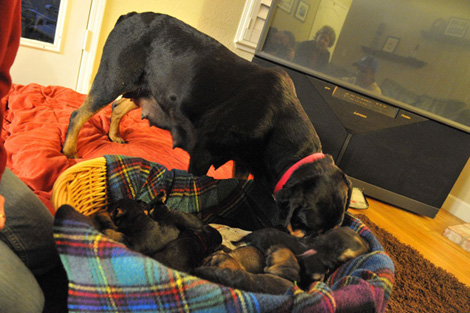 Within days of having their lives turned upside down, one of the Rottweilers (now named Mia) gave birth to ten plump, vigorous, hungry puppies- six girls and four boys. She and her pups are receiving foster care and living the good life with Jill (one of our hospital receptionists) and her family. Jill tells me that this has been an incredible and wonderful experience for her family. They have fallen in love with Mia (they may have trouble letting her go) and watching the puppies change day by day has been extraordinary. Mia is the “model mom,” nurturing her pups and welcoming the companionship of her new human family. The pups have just opened their eyes and are quickly developing different personalities. Some are calm and unobtrusive while others have become pushy, persistently demanding their mama’s attention and pushing others out of the way to get it. The pups are named (at least temporarily) Abby, Bandit, Charli, Delilah, Ember, Freda, Giovani, Hans, Ivan, and Juno. A few look like Rottweilers- the others clearly have mixed breed markings. To date, six of Mia’s pups are spoken for.